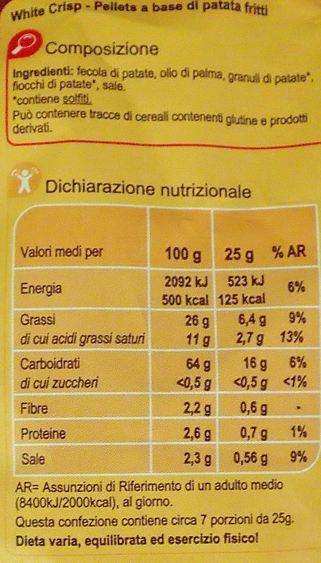 Barcode EAN:   8012666008360 Energy kcal/100g:   500 Satured Fat (per 100g)g:   11 Sugar into Carbohydrates (per 100g)g:   0.4 Proteines (per 100g)g:   2.6 Calcium CA/ mg (per 100g)g:   Gluten:   Production type:   Made in:   Italy Price €:   Bought here:   Last update:   2016-07-09 18:24:19 | Brand:   Fat (per 100g)g:   26 Carbohydrates (per 100g)g:   64 Fiber (per 100g)g:   2.2 Salt - Sodium (per 100g)g:   2.3 Ingredients (Indicative):   |