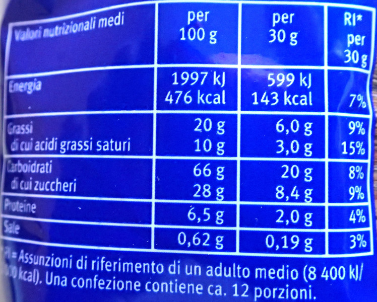 Barcode EAN:   4017100383618 Energy kcal/100g:   476 Satured Fat (per 100g)g:   10 Sugar into Carbohydrates (per 100g)g:   28 Proteines (per 100g)g:   6.5 Calcium CA/ mg (per 100g)g:   Gluten:   Production type:   Made in:   Italy Price €:   Bought here:   Last update:   2016-07-09 18:56:26 | Brand:   Fat (per 100g)g:   20 Carbohydrates (per 100g)g:   66 Fiber (per 100g)g:   Salt - Sodium (per 100g)g:   0.62 Ingredients (Indicative):   |