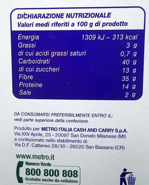 Barcode EAN:   802924050251 Energy kcal/100g:   313 Satured Fat (per 100g)g:   0.7 Sugar into Carbohydrates (per 100g)g:   13 Proteines (per 100g)g:   14 Calcium CA/ mg (per 100g)g:   Gluten:   Production type:   Made in:   Italy Price €:   Bought here:   Last update:   2016-08-12 19:29:17 | Brand:   Fat (per 100g)g:   3 Carbohydrates (per 100g)g:   40 Fiber (per 100g)g:   35 Salt - Sodium (per 100g)g:   2 Ingredients (Indicative):   |