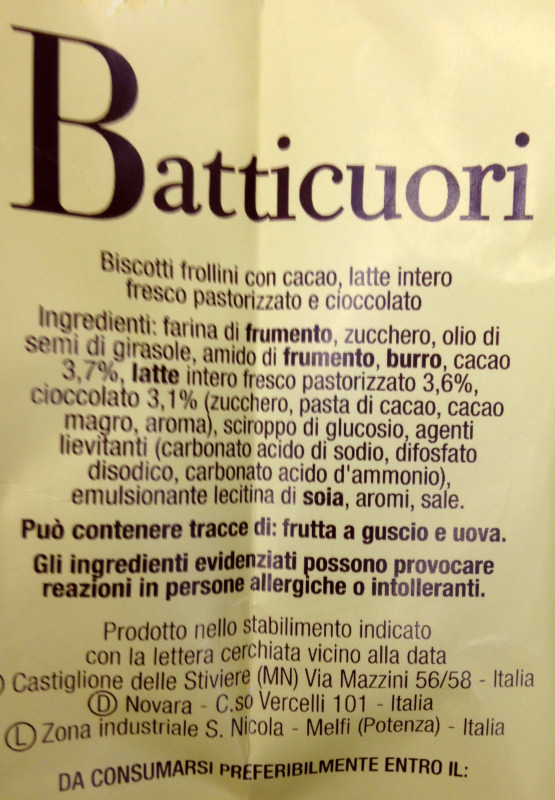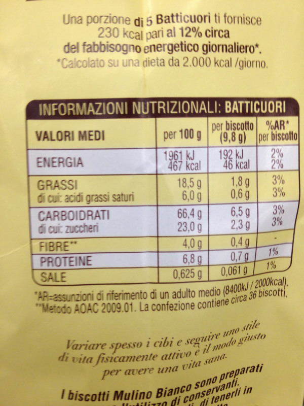 Barcode EAN:   8076809538886 Energy kcal/100g:   467 Satured Fat (per 100g)g:   6 Sugar into Carbohydrates (per 100g)g:   23 Proteines (per 100g)g:   6.8 Calcium CA/ mg (per 100g)g:   Gluten:   Production type:   Made in:   Italy Price €:   Bought here:   Last update:   2016-08-26 19:37:17 | Brand:   Fat (per 100g)g:   18.5 Carbohydrates (per 100g)g:   66.4 Fiber (per 100g)g:   4 Salt - Sodium (per 100g)g:   0.625 Ingredients (Indicative):   |