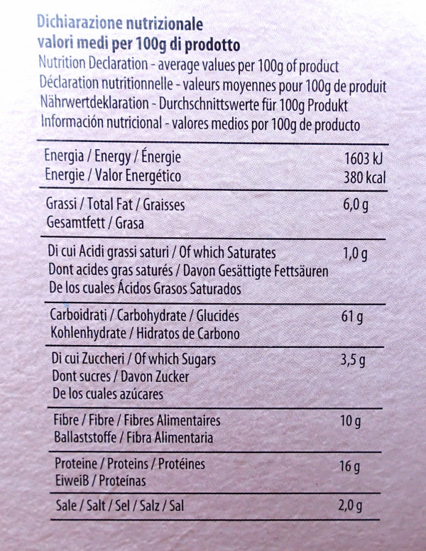 Barcode EAN:   8002234890169 Energy kcal/100g:   380 Satured Fat (per 100g)g:   1 Sugar into Carbohydrates (per 100g)g:   3.5 Proteines (per 100g)g:   16 Calcium CA/ mg (per 100g)g:   Gluten:   Production type:   Made in:   Italy Price €:   Bought here:   Last update:   2016-08-27 17:57:54 | Brand:   Fat (per 100g)g:   6 Carbohydrates (per 100g)g:   61 Fiber (per 100g)g:   10 Salt - Sodium (per 100g)g:   2 Ingredients (Indicative):   |