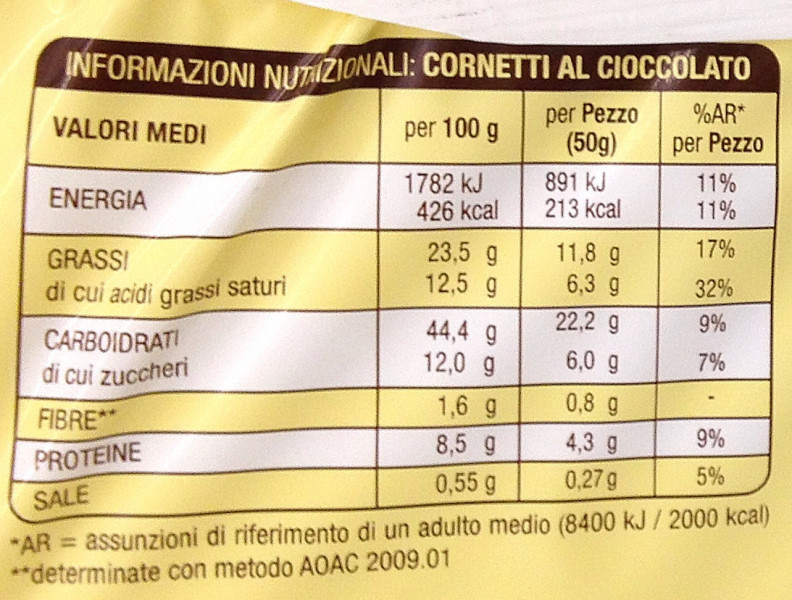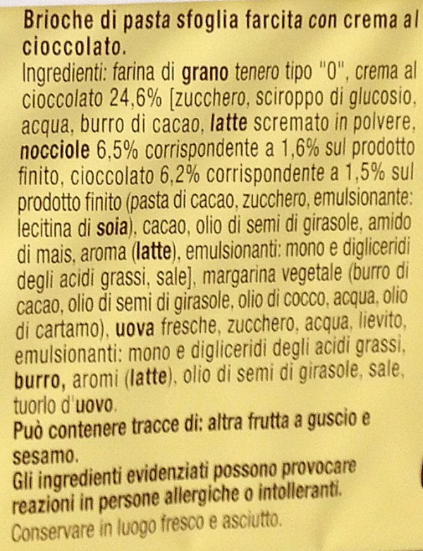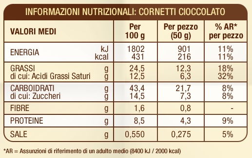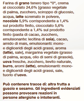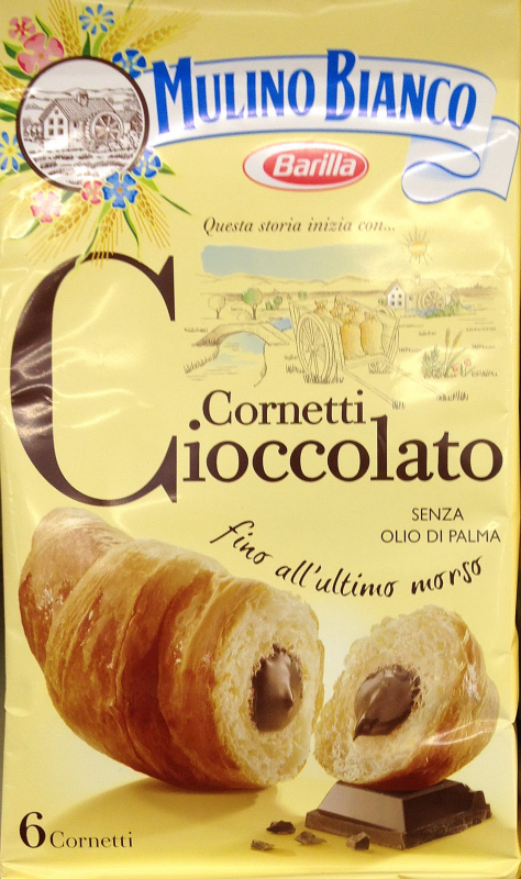 Barcode EAN:   8076809542746 Energy kcal/100g:   426 Satured Fat (per 100g)g:   12.5 Sugar into Carbohydrates (per 100g)g:   12 Proteines (per 100g)g:   8.5 Calcium CA/ mg (per 100g)g:   Gluten:   Production type:   Made in:   Italy Price €:   Bought here:   Last update:   2016-08-29 18:02:13 | Brand:   Fat (per 100g)g:   23.5 Carbohydrates (per 100g)g:   44.4 Fiber (per 100g)g:   1.6 Salt - Sodium (per 100g)g:   0.55 Ingredients (Indicative):   |