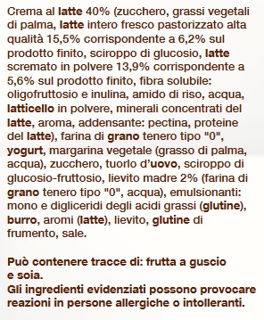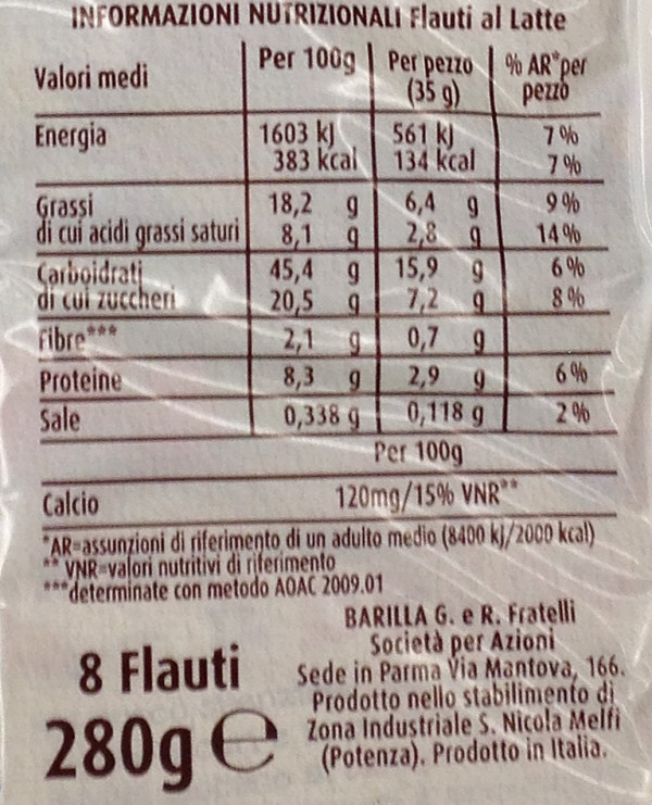 Barcode EAN:   8076809524292 Energy kcal/100g:   383 Satured Fat (per 100g)g:   8.1 Sugar into Carbohydrates (per 100g)g:   20.5 Proteines (per 100g)g:   8.3 Calcium CA/ mg (per 100g)g:   Gluten:   Production type:   Made in:   Italy Price €:   Bought here:   Last update:   2016-08-29 18:29:18 | Brand:   Fat (per 100g)g:   18.2 Carbohydrates (per 100g)g:   45.4 Fiber (per 100g)g:   2.1 Salt - Sodium (per 100g)g:   0.338 Ingredients (Indicative):   |