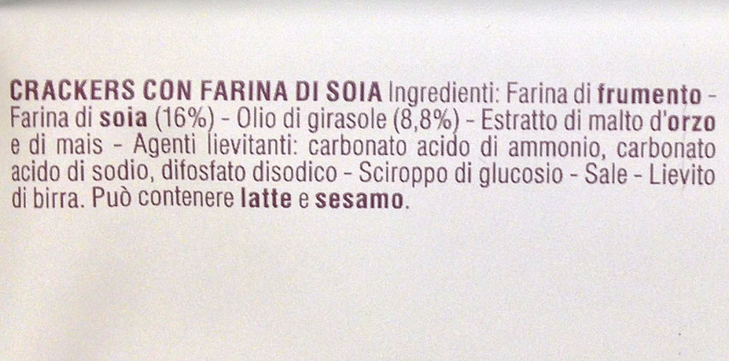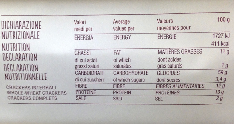 Barcode EAN:   8002590042752 Energy kcal/100g:   439 Satured Fat (per 100g)g:   1.2 Sugar into Carbohydrates (per 100g)g:   4.1 Proteines (per 100g)g:   15 Calcium CA/ mg (per 100g)g:   Gluten:   Production type:   Made in:   Italy Price €:   Bought here:   Last update:   2016-09-01 15:18:29 | Brand:   Fat (per 100g)g:   14 Carbohydrates (per 100g)g:   61 Fiber (per 100g)g:   4.4 Salt - Sodium (per 100g)g:   2 Ingredients (Indicative):   |