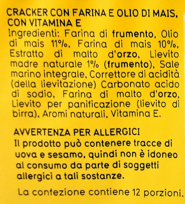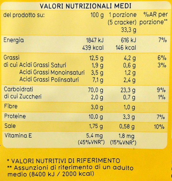 Barcode EAN:   8002190002545 Energy kcal/100g:   439 Satured Fat (per 100g)g:   1.9 Sugar into Carbohydrates (per 100g)g:   2 Proteines (per 100g)g:   10 Calcium CA/ mg (per 100g)g:   Gluten:   Production type:   Made in:   Italy Price €:   Bought here:   Last update:   2016-09-01 19:41:22 | Brand:   Fat (per 100g)g:   12.5 Carbohydrates (per 100g)g:   70 Fiber (per 100g)g:   3 Salt - Sodium (per 100g)g:   1.75 Ingredients (Indicative):   |