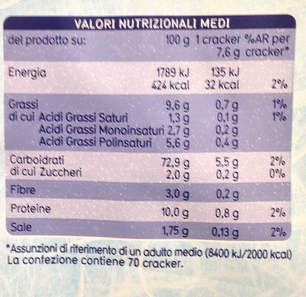 Barcode EAN:   8002190002866 Energy kcal/100g:   424 Satured Fat (per 100g)g:   1.3 Sugar into Carbohydrates (per 100g)g:   2 Proteines (per 100g)g:   10 Calcium CA/ mg (per 100g)g:   Gluten:   Production type:   Made in:   Italy Price €:   Bought here:   Last update:   2016-09-01 19:56:21 | Brand:   Fat (per 100g)g:   9.6 Carbohydrates (per 100g)g:   72.9 Fiber (per 100g)g:   3 Salt - Sodium (per 100g)g:   1.75 Ingredients (Indicative):   |