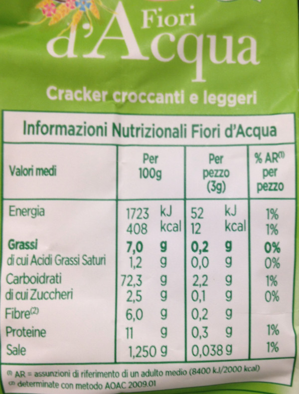 Barcode EAN:   8076809520003 Energy kcal/100g:   408 Satured Fat (per 100g)g:   1.2 Sugar into Carbohydrates (per 100g)g:   2.5 Proteines (per 100g)g:   11 Calcium CA/ mg (per 100g)g:   Gluten:   Production type:   Made in:   Italy Price €:   Bought here:   Last update:   2016-09-01 21:16:56 | Brand:   Fat (per 100g)g:   7 Carbohydrates (per 100g)g:   72.3 Fiber (per 100g)g:   6 Salt - Sodium (per 100g)g:   1.25 Ingredients (Indicative):   |
