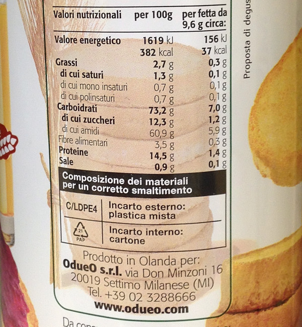 Barcode EAN:   8034076733908 Energy kcal/100g:   382 Satured Fat (per 100g)g:   1.3 Sugar into Carbohydrates (per 100g)g:   12.3 Proteines (per 100g)g:   14.5 Calcium CA/ mg (per 100g)g:   Gluten:   Production type:   Made in:   Netherlands Price €:   Bought here:   Last update:   2016-09-03 09:05:15 | Brand:   Fat (per 100g)g:   2.7 Carbohydrates (per 100g)g:   73.2 Fiber (per 100g)g:   3.5 Salt - Sodium (per 100g)g:   0.9 Ingredients (Indicative):