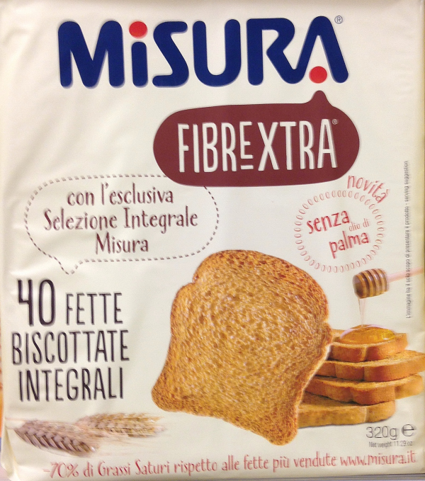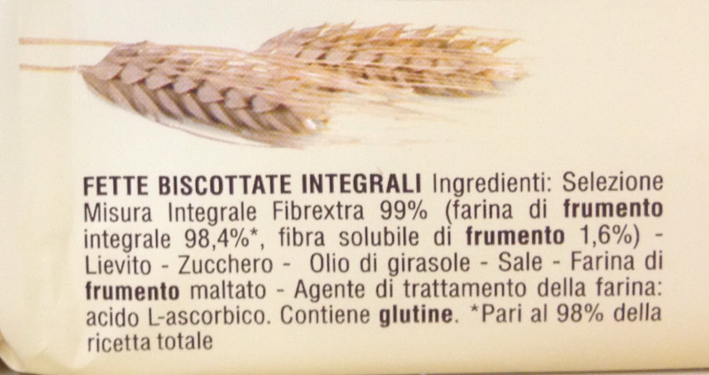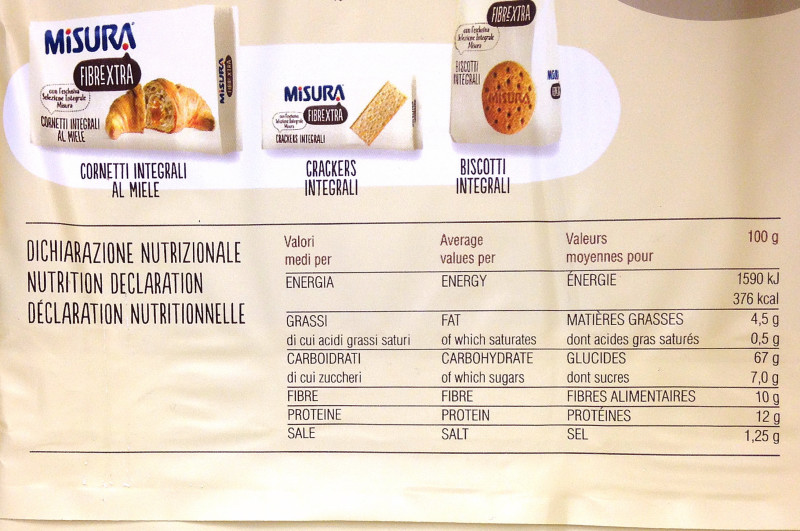 Barcode EAN:   8002590043148 Energy kcal/100g:   376 Satured Fat (per 100g)g:   0.5 Sugar into Carbohydrates (per 100g)g:   7 Proteines (per 100g)g:   12 Calcium CA/ mg (per 100g)g:   Gluten:   Production type:   Made in:   Italy Price €:   Bought here:   Last update:   2016-09-03 10:10:17 | Brand:   Fat (per 100g)g:   4.5 Carbohydrates (per 100g)g:   67 Fiber (per 100g)g:   10 Salt - Sodium (per 100g)g:   1.25 Ingredients (Indicative):   |