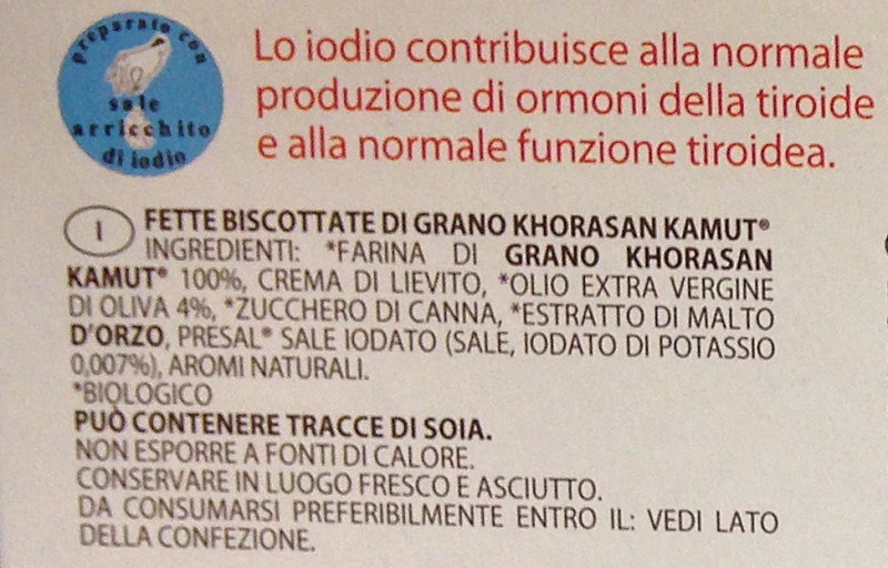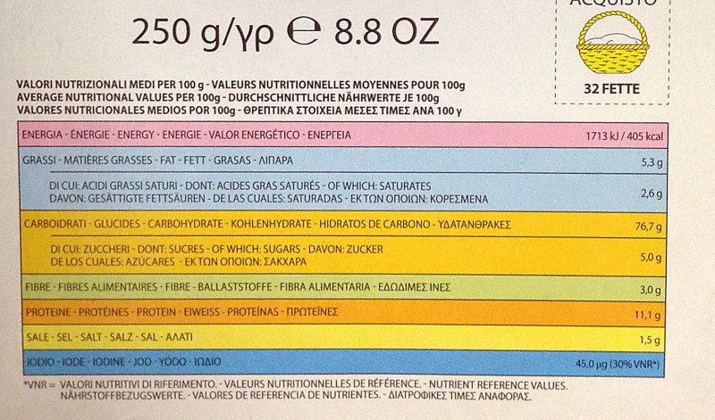 Barcode EAN:   8001405000048 Energy kcal/100g:   398 Satured Fat (per 100g)g:   1.1 Sugar into Carbohydrates (per 100g)g:   8.6 Proteines (per 100g)g:   14.4 Calcium CA/ mg (per 100g)g:   Gluten:   Production type:   Made in:   Italy Price €:   Bought here:   Last update:   2016-09-03 12:09:40 | Brand:   Fat (per 100g)g:   5.8 Carbohydrates (per 100g)g:   70.3 Fiber (per 100g)g:   3.5 Salt - Sodium (per 100g)g:   2.1 Ingredients (Indicative):   |