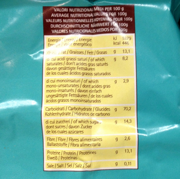 Barcode EAN:   8005740091198 Energy kcal/100g:   446 Satured Fat (per 100g)g:   8.2 Sugar into Carbohydrates (per 100g)g:   14.3 Proteines (per 100g)g:   13.1 Calcium CA/ mg (per 100g)g:   Gluten:   Production type:   Made in:   Italy Price €:   Bought here:   Last update:   2016-09-04 17:58:24 | Brand:   Fat (per 100g)g:   13.1 Carbohydrates (per 100g)g:   70.2 Fiber (per 100g)g:   2.6 Salt - Sodium (per 100g)g:   0.11 Ingredients (Indicative):   |