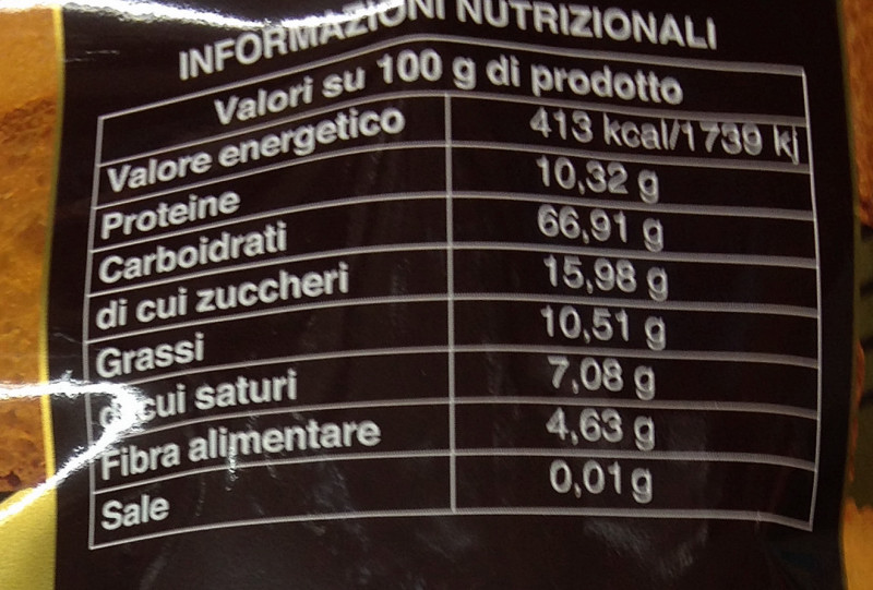 Barcode EAN:   8000643000407 Energy kcal/100g:   413 Satured Fat (per 100g)g:   7.08 Sugar into Carbohydrates (per 100g)g:   15.98 Proteines (per 100g)g:   10.32 Calcium CA/ mg (per 100g)g:   Gluten:   Production type:   Made in:   Italy Price €:   Bought here:   Last update:   2016-09-05 15:07:02 | Brand:   Fat (per 100g)g:   10.51 Carbohydrates (per 100g)g:   66.91 Fiber (per 100g)g:   4.63 Salt - Sodium (per 100g)g:   0.01 Ingredients (Indicative):   |