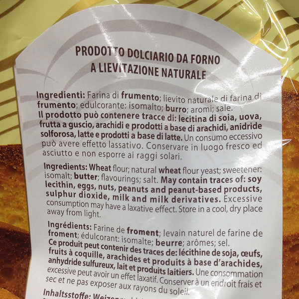 Barcode EAN:   8000643000384 Energy kcal/100g:   402 Satured Fat (per 100g)g:   4.88 Sugar into Carbohydrates (per 100g)g:   0.15 Proteines (per 100g)g:   10.49 Calcium CA/ mg (per 100g)g:   Gluten:   Production type:   Made in:   Italy Price €:   Bought here:   Last update:   2016-09-05 17:31:25 | Brand:   Fat (per 100g)g:   11.54 Carbohydrates (per 100g)g:   71.79 Fiber (per 100g)g:   2.8 Salt - Sodium (per 100g)g:   0.07 Ingredients (Indicative):   |
