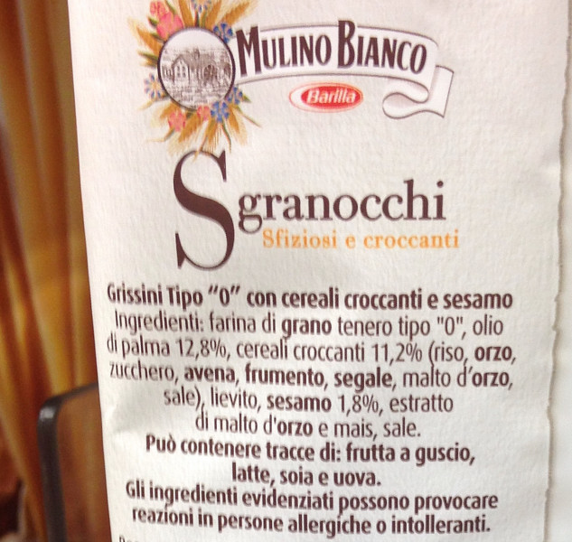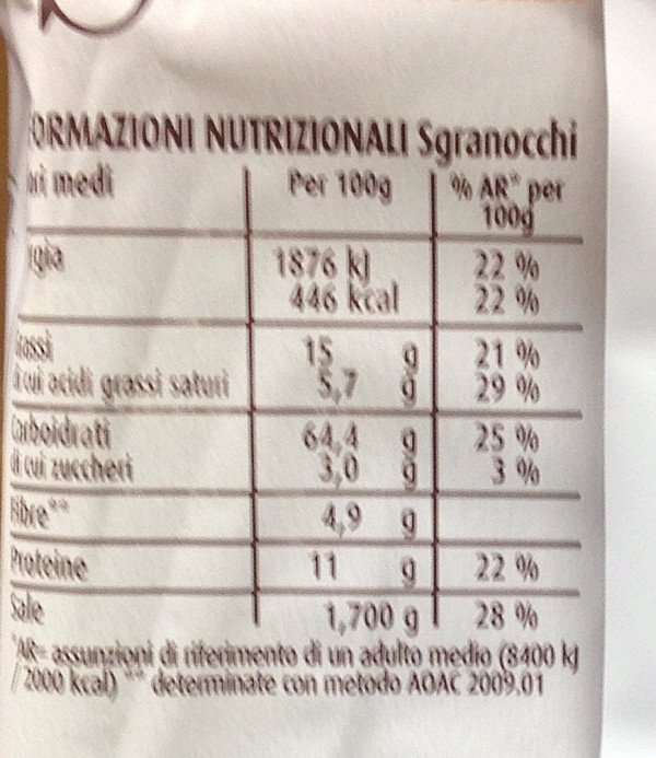 Barcode EAN:   8076809538688 Energy kcal/100g:   446 Satured Fat (per 100g)g:   5.7 Sugar into Carbohydrates (per 100g)g:   3 Proteines (per 100g)g:   11 Calcium CA/ mg (per 100g)g:   Gluten:   Production type:   Made in:   Italy Price €:   Bought here:   Last update:   2016-09-05 18:43:27 | Brand:   Fat (per 100g)g:   15 Carbohydrates (per 100g)g:   64.4 Fiber (per 100g)g:   4.9 Salt - Sodium (per 100g)g:   1.7 Ingredients (Indicative):   |