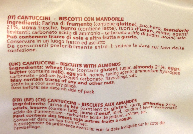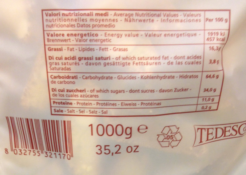 Barcode EAN:   8000895191250 Energy kcal/100g:   463 Satured Fat (per 100g)g:   4.3 Sugar into Carbohydrates (per 100g)g:   32 Proteines (per 100g)g:   10 Calcium CA/ mg (per 100g)g:   Gluten:   Production type:   Made in:   Italy Price €:   Bought here:   Last update:   2016-09-28 18:32:41 | Brand:   Fat (per 100g)g:   18 Carbohydrates (per 100g)g:   63 Fiber (per 100g)g:   4.7 Salt - Sodium (per 100g)g:   0.75 Ingredients (Indicative):   |