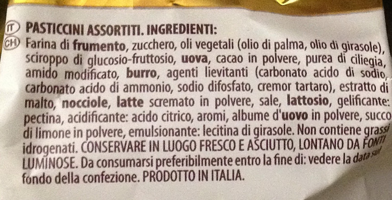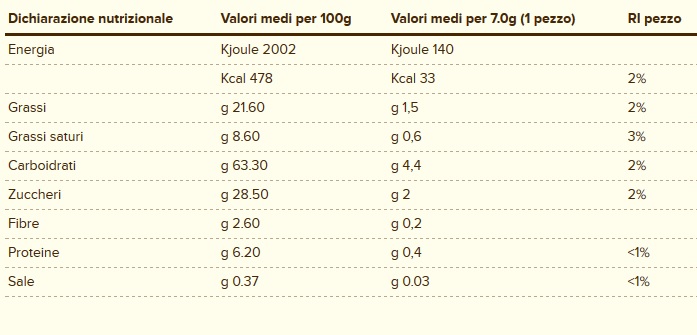 Barcode EAN:   8000350001186 Energy kcal/100g:   478 Satured Fat (per 100g)g:   8.6 Sugar into Carbohydrates (per 100g)g:   28.5 Proteines (per 100g)g:   6.2 Calcium CA/ mg (per 100g)g:   Gluten:   Production type:   Made in:   Italy Price €:   Bought here:   Last update:   2016-09-28 19:06:03 | Brand:   Fat (per 100g)g:   21.6 Carbohydrates (per 100g)g:   63.3 Fiber (per 100g)g:   2.6 Salt - Sodium (per 100g)g:   0.37 Ingredients (Indicative):   |