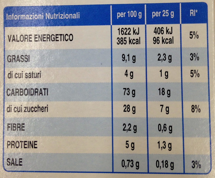 Barcode EAN:   5050083776274 Energy kcal/100g:   385 Satured Fat (per 100g)g:   4 Sugar into Carbohydrates (per 100g)g:   28 Proteines (per 100g)g:   5 Calcium CA/ mg (per 100g)g:   Gluten:   Production type:   Made in:   Price €:   Bought here:   Last update:   2016-09-30 19:40:33 | Brand:   Fat (per 100g)g:   9.1 Carbohydrates (per 100g)g:   73 Fiber (per 100g)g:   2.2 Salt - Sodium (per 100g)g:   0.73 Ingredients (Indicative):   |