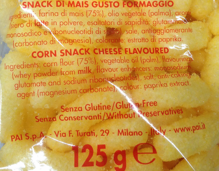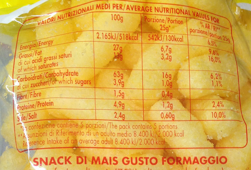 Barcode EAN:   8041790504967 Energy kcal/100g:   518 Satured Fat (per 100g)g:   13 Sugar into Carbohydrates (per 100g)g:   3.9 Proteines (per 100g)g:   4.9 Calcium CA/ mg (per 100g)g:   Gluten:   Production type:   Made in:   Italy Price €:   Bought here:   Last update:   2016-10-01 11:19:47 | Brand:   Fat (per 100g)g:   27 Carbohydrates (per 100g)g:   63 Fiber (per 100g)g:   1.5 Salt - Sodium (per 100g)g:   2.4 Ingredients (Indicative):   |