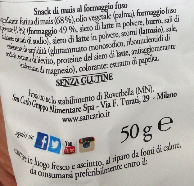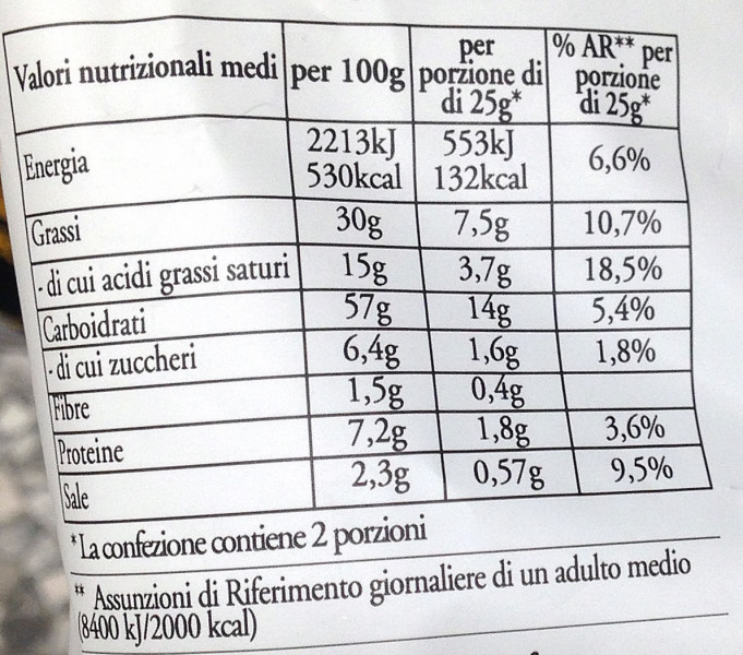 Barcode EAN:   8003130341250 Energy kcal/100g:   530 Satured Fat (per 100g)g:   15 Sugar into Carbohydrates (per 100g)g:   6.4 Proteines (per 100g)g:   7.2 Calcium CA/ mg (per 100g)g:   Gluten:   Production type:   Made in:   Italy Price €:   Bought here:   Last update:   2016-10-01 16:38:18 | Brand:   Fat (per 100g)g:   30 Carbohydrates (per 100g)g:   57 Fiber (per 100g)g:   1.5 Salt - Sodium (per 100g)g:   2.3 Ingredients (Indicative):   |