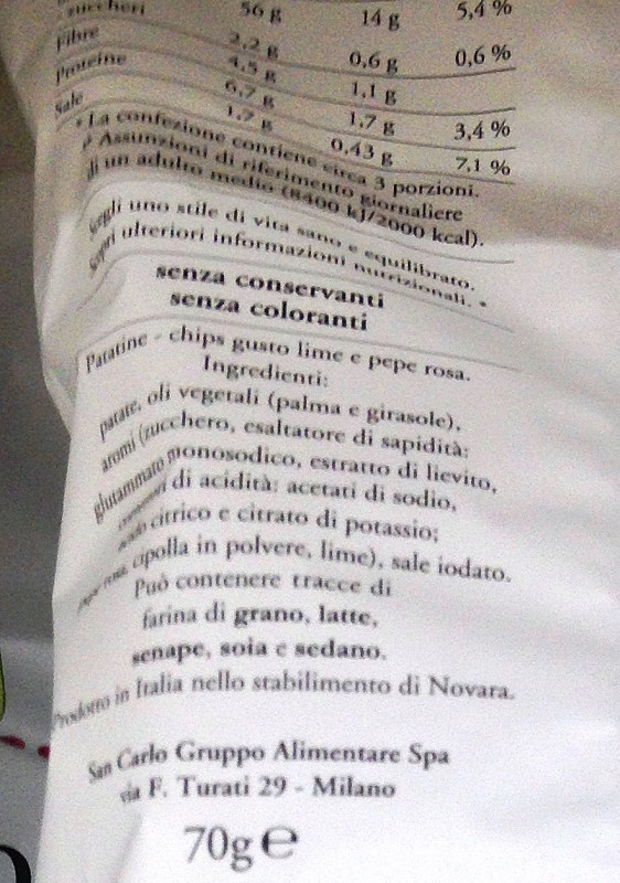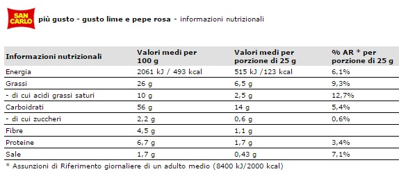 Barcode EAN:   8003130141232 Energy kcal/100g:   493 Satured Fat (per 100g)g:   10 Sugar into Carbohydrates (per 100g)g:   2.2 Proteines (per 100g)g:   6.7 Calcium CA/ mg (per 100g)g:   Gluten:   Production type:   Made in:   Italy Price €:   Bought here:   Last update:   2016-10-01 18:03:54 | Brand:   Fat (per 100g)g:   26 Carbohydrates (per 100g)g:   56 Fiber (per 100g)g:   4.5 Salt - Sodium (per 100g)g:   1.7 Ingredients (Indicative):   |