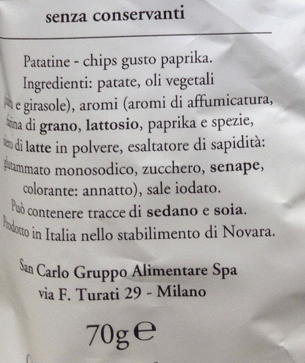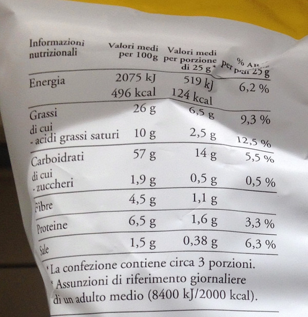 Barcode EAN:   8003130141232 Energy kcal/100g:   496 Satured Fat (per 100g)g:   10 Sugar into Carbohydrates (per 100g)g:   1.9 Proteines (per 100g)g:   6.5 Calcium CA/ mg (per 100g)g:   Gluten:   Production type:   Made in:   Italy Price €:   Bought here:   Last update:   2021-02-09 16:54:33 | Brand:   Fat (per 100g)g:   26 Carbohydrates (per 100g)g:   57 Fiber (per 100g)g:   4.5 Salt - Sodium (per 100g)g:   1.5 Ingredients (Indicative):   |