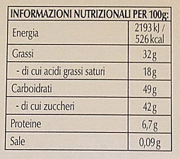 Barcode EAN:   3046920028370 Energy kcal/100g:   526 Satured Fat (per 100g)g:   18 Sugar into Carbohydrates (per 100g)g:   42 Proteines (per 100g)g:   6.7 Calcium CA/ mg (per 100g)g:   Gluten:   Production type:   Made in:   Switzerland Price €:   Bought here:   Last update:   2016-10-03 10:07:35 | Brand:   Fat (per 100g)g:   32 Carbohydrates (per 100g)g:   49 Fiber (per 100g)g:   Salt - Sodium (per 100g)g:   0.09 Ingredients (Indicative):   |
