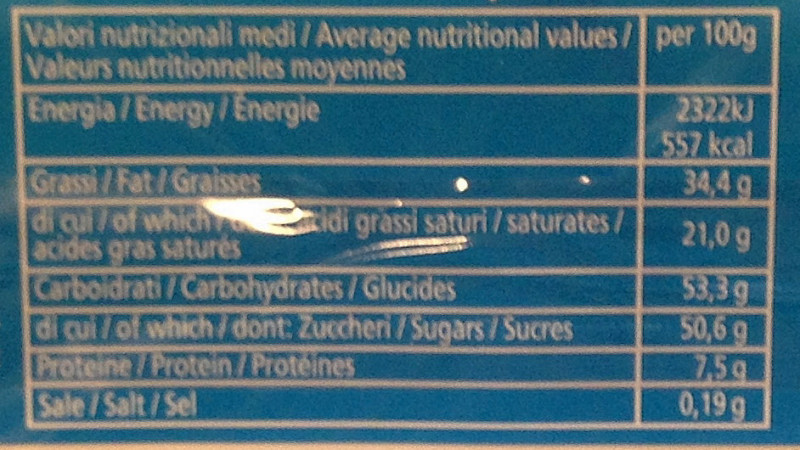 Barcode EAN:   8006380211205 Energy kcal/100g:   557 Satured Fat (per 100g)g:   21 Sugar into Carbohydrates (per 100g)g:   50.6 Proteines (per 100g)g:   7.5 Calcium CA/ mg (per 100g)g:   Gluten:   Production type:   Made in:   Italy Price €:   Bought here:   Last update:   2016-10-04 19:13:21 | Brand:   Fat (per 100g)g:   34.4 Carbohydrates (per 100g)g:   53.3 Fiber (per 100g)g:   Salt - Sodium (per 100g)g:   0.19 Ingredients (Indicative):   |