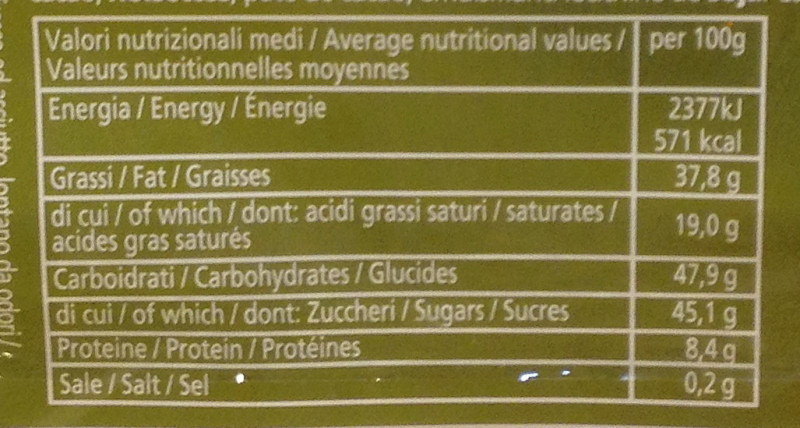 Barcode EAN:   8006380212202 Energy kcal/100g:   571 Satured Fat (per 100g)g:   19 Sugar into Carbohydrates (per 100g)g:   45.1 Proteines (per 100g)g:   8.4 Calcium CA/ mg (per 100g)g:   Gluten:   Production type:   Made in:   Italy Price €:   Bought here:   Last update:   2016-10-05 18:26:47 | Brand:   Fat (per 100g)g:   37.8 Carbohydrates (per 100g)g:   47.9 Fiber (per 100g)g:   Salt - Sodium (per 100g)g:   0.2 Ingredients (Indicative):   |