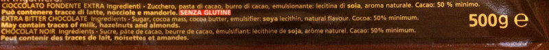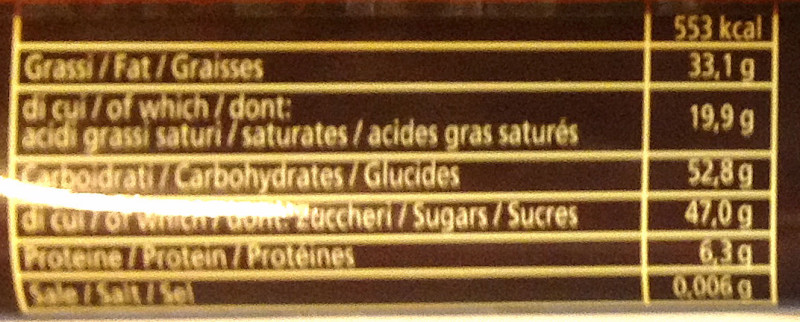 Barcode EAN:   8006380215500 Energy kcal/100g:   553 Satured Fat (per 100g)g:   19.9 Sugar into Carbohydrates (per 100g)g:   47 Proteines (per 100g)g:   6.3 Calcium CA/ mg (per 100g)g:   Gluten:   Production type:   Made in:   Italy Price €: