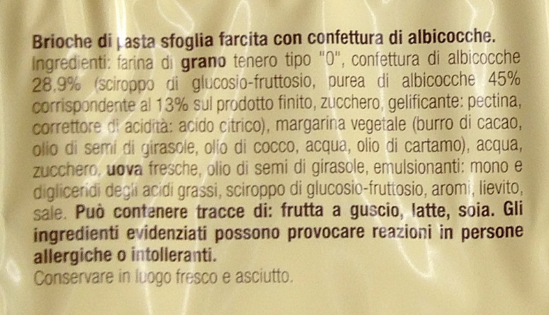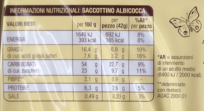 Barcode EAN:   8076809536561 Energy kcal/100g:   393 Satured Fat (per 100g)g:   7.6 Sugar into Carbohydrates (per 100g)g:   23 Proteines (per 100g)g:   6.3 Calcium CA/ mg (per 100g)g:   Gluten:   Production type:   Made in:   Italy Price €:   Bought here:   Last update:   2016-10-11 17:29:43 | Brand:   Fat (per 100g)g:   16.4 Carbohydrates (per 100g)g:   54 Fiber (per 100g)g:   2.1 Salt - Sodium (per 100g)g:   0.49 Ingredients (Indicative):   |