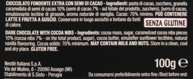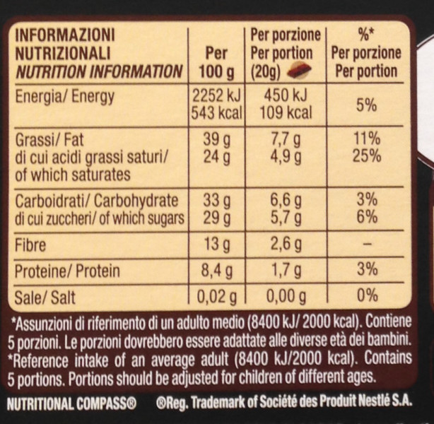 Barcode EAN:   8000300184419 Energy kcal/100g:   543 Satured Fat (per 100g)g:   24 Sugar into Carbohydrates (per 100g)g:   29 Proteines (per 100g)g:   8.4 Calcium CA/ mg (per 100g)g:   Gluten:   Production type:   Made in:   Italy Price €:   Bought here:   Last update:   2016-10-11 18:12:50 | Brand:   Fat (per 100g)g:   39 Carbohydrates (per 100g)g:   33 Fiber (per 100g)g:   13 Salt - Sodium (per 100g)g:   0.02 Ingredients (Indicative):   |