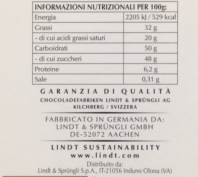 Barcode EAN:   3046920029674 Energy kcal/100g:   529 Satured Fat (per 100g)g:   20 Sugar into Carbohydrates (per 100g)g:   48 Proteines (per 100g)g:   6.2 Calcium CA/ mg (per 100g)g:   Gluten:   Production type:   Made in:   Germany Price €:   Bought here:   Last update:   2016-10-11 19:20:50 | Brand:   Fat (per 100g)g:   32 Carbohydrates (per 100g)g:   50 Fiber (per 100g)g:   Salt - Sodium (per 100g)g:   0.31 Ingredients (Indicative):   |