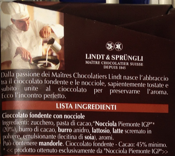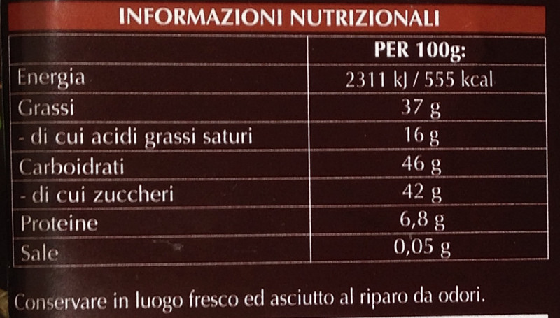Barcode EAN:   8003340068114 Energy kcal/100g:   555 Satured Fat (per 100g)g:   16 Sugar into Carbohydrates (per 100g)g:   42 Proteines (per 100g)g:   6.8 Calcium CA/ mg (per 100g)g:   Gluten:   Production type:   Made in:   Italy Price €:   Bought here:   Last update:   2016-10-12 18:43:00 | Brand:   Fat (per 100g)g:   37 Carbohydrates (per 100g)g:   46 Fiber (per 100g)g:   Salt - Sodium (per 100g)g:   0.05 Ingredients (Indicative):   |