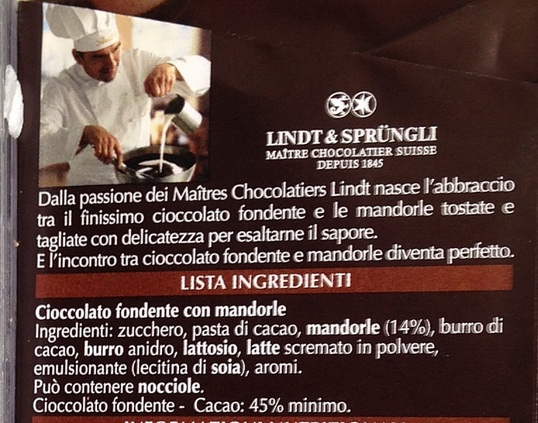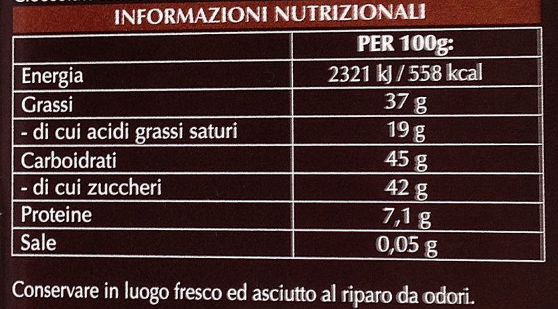 Barcode EAN:   8003340030869 Energy kcal/100g:   558 Satured Fat (per 100g)g:   19 Sugar into Carbohydrates (per 100g)g:   42 Proteines (per 100g)g:   7.1 Calcium CA/ mg (per 100g)g:   Gluten:   Production type:   Made in:   Italy Price €:   Bought here:   Last update:   2016-10-12 18:56:09 | Brand:   Fat (per 100g)g:   37 Carbohydrates (per 100g)g:   45 Fiber (per 100g)g:   Salt - Sodium (per 100g)g:   0.05 Ingredients (Indicative):   |