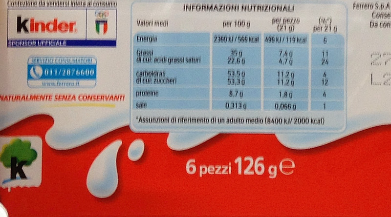 Barcode EAN:   80310167 Energy kcal/100g:   566 Satured Fat (per 100g)g:   22.6 Sugar into Carbohydrates (per 100g)g:   53.3 Proteines (per 100g)g:   8.7 Calcium CA/ mg (per 100g)g:   Gluten:   Production type:   Made in:   Italy Price €:   Bought here:   Last update:   2016-10-14 12:02:35 | Brand:   Fat (per 100g)g:   35 Carbohydrates (per 100g)g:   53.5 Fiber (per 100g)g:   Salt - Sodium (per 100g)g:   0.313 Ingredients (Indicative):   |