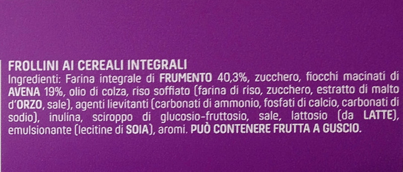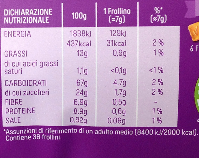 Barcode EAN:   8100090000590 Energy kcal/100g:   437 Satured Fat (per 100g)g:   1.1 Sugar into Carbohydrates (per 100g)g:   24 Proteines (per 100g)g:   8.9 Calcium CA/ mg (per 100g)g:   Gluten:   Production type:   Made in:   Italy Price €:   Bought here:   Last update:   2016-10-14 15:47:38 | Brand:   Fat (per 100g)g:   13 Carbohydrates (per 100g)g:   67 Fiber (per 100g)g:   6.9 Salt - Sodium (per 100g)g:   0.92 Ingredients (Indicative):   |