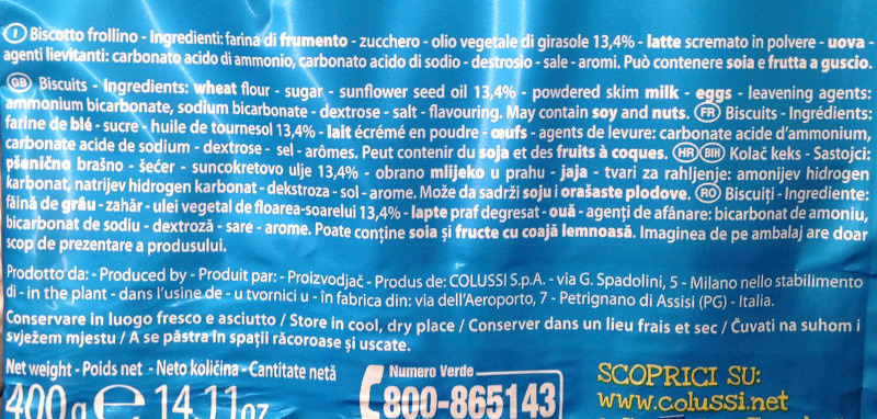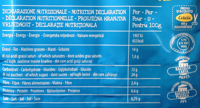 Barcode EAN:   8002590045036 Energy kcal/100g:   453 Satured Fat (per 100g)g:   1.6 Sugar into Carbohydrates (per 100g)g:   24 Proteines (per 100g)g:   9.6 Calcium CA/ mg (per 100g)g:   Gluten:   Production type:   Made in:   Italy Price €:   Bought here:   Last update:   2016-10-15 19:52:59 | Brand:   Fat (per 100g)g:   14 Carbohydrates (per 100g)g:   72 Fiber (per 100g)g:   2.4 Salt - Sodium (per 100g)g:   0.75 Ingredients (Indicative):   |