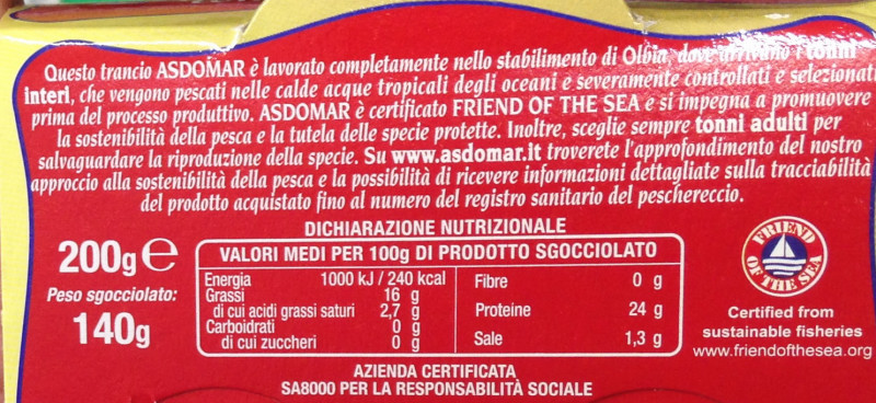 Barcode EAN:   8003294540216 Energy kcal/100g:   240 Satured Fat (per 100g)g:   2.7 Polyunsaturated Fat (per 100g)g:   Sugar into Carbohydrates (per 100g)g:   Salt - Sodium (per 100g)g:   1.3 From:   India Indicative price €:   Last update:   2016-10-17 11:22:06 | Brand:   Fat (per 100g)g:   16 Monounsaturated Fat (per 100g)g (per 100g)g:   Carbohydrates (per 100g)g:   Proteines (per 100g)g:   24 Ingredients (Indicative):   |