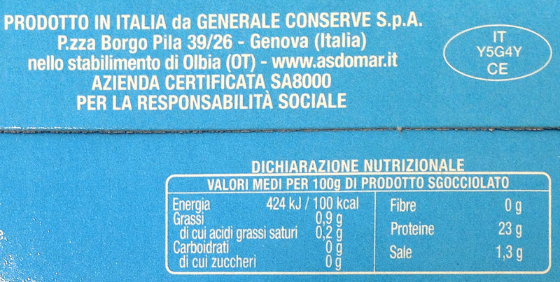Barcode EAN:   8003294750349 Energy kcal/100g:   100 Satured Fat (per 100g)g:   0.2 Polyunsaturated Fat (per 100g)g:   Sugar into Carbohydrates (per 100g)g:   Salt - Sodium (per 100g)g:   1.3 From:   Indicative price €:   Last update:   2016-10-17 17:48:22 | Brand:   Fat (per 100g)g:   0.9 Monounsaturated Fat (per 100g)g (per 100g)g:   Carbohydrates (per 100g)g:   Proteines (per 100g)g:   23 Ingredients (Indicative):   |