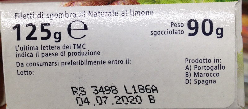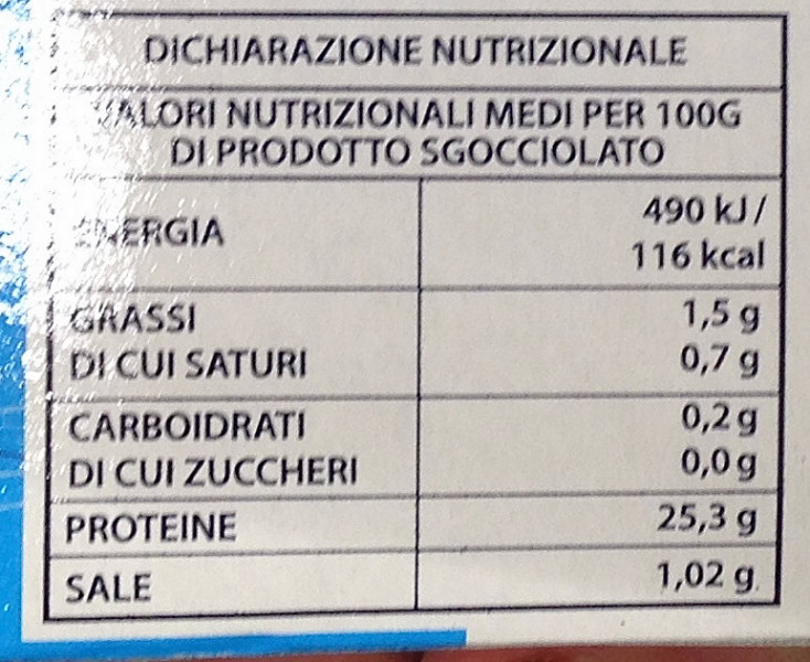Barcode EAN:   8005960500685 Energy kcal/100g:   116 Satured Fat (per 100g)g:   0.7 Polyunsaturated Fat (per 100g)g:   Sugar into Carbohydrates (per 100g)g:   Salt - Sodium (per 100g)g:   1.02 From:   Morocco Indicative price €:   Last update:   2016-10-18 18:57:08 | Brand:   Fat (per 100g)g:   1.5 Monounsaturated Fat (per 100g)g (per 100g)g:   Carbohydrates (per 100g)g:   0.2 Proteines (per 100g)g:   25.3 Ingredients (Indicative):   |