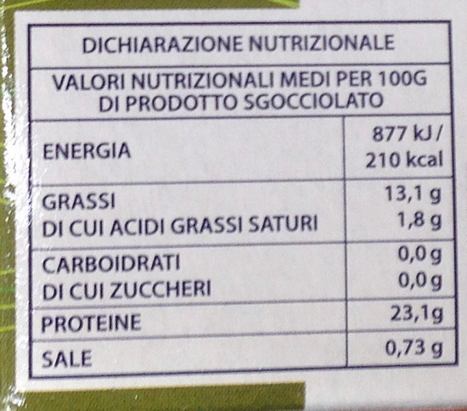 Barcode EAN:   80436874 Energy kcal/100g:   210 Satured Fat (per 100g)g:   1.8 Polyunsaturated Fat (per 100g)g:   Sugar into Carbohydrates (per 100g)g:   Salt - Sodium (per 100g)g:   0.73 From:   Indicative price €:   Last update:   2016-10-18 19:11:43 | Brand:   Fat (per 100g)g:   13.1 Monounsaturated Fat (per 100g)g (per 100g)g:   Carbohydrates (per 100g)g:   Proteines (per 100g)g:   23.1 Ingredients (Indicative):   |
