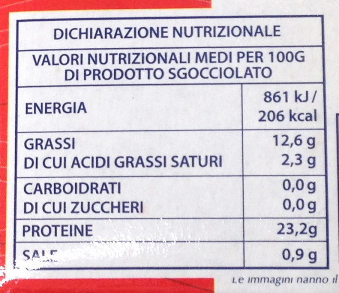 Barcode EAN:   80456063 Energy kcal/100g:   206 Satured Fat (per 100g)g:   2.3 Polyunsaturated Fat (per 100g)g:   Sugar into Carbohydrates (per 100g)g:   Salt - Sodium (per 100g)g:   0.9 From:   Indicative price €:   Last update:   2016-10-18 19:31:27 | Brand:   Fat (per 100g)g:   12.6 Monounsaturated Fat (per 100g)g (per 100g)g:   Carbohydrates (per 100g)g:   Proteines (per 100g)g:   23.2 Ingredients (Indicative):   |