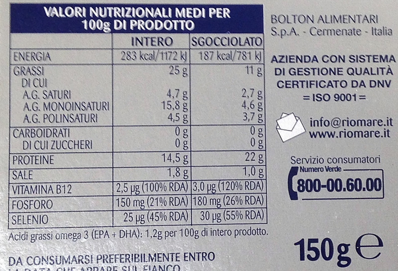 Barcode EAN:   8004030087002 Energy kcal/100g:   283 Satured Fat (per 100g)g:   4.7 Polyunsaturated Fat (per 100g)g:   4.5 Sugar into Carbohydrates (per 100g)g:   Salt - Sodium (per 100g)g:   1.8 From:   Indicative price €:   Last update:   2016-10-19 18:42:27 | Brand:   Fat (per 100g)g:   25 Monounsaturated Fat (per 100g)g (per 100g)g:   15.8 Carbohydrates (per 100g)g:   Proteines (per 100g)g:   14.5 Ingredients (Indicative):   |