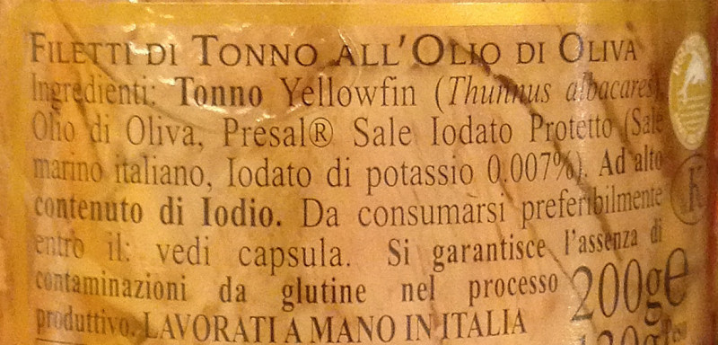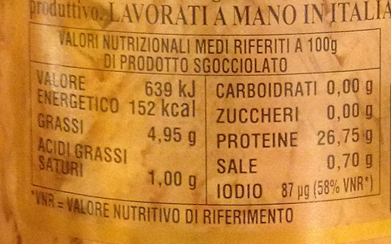 Barcode EAN:   80533962 Energy kcal/100g:   152 Satured Fat (per 100g)g:   1 Polyunsaturated Fat (per 100g)g:   Sugar into Carbohydrates (per 100g)g:   Salt - Sodium (per 100g)g:   0.7 From:   Indicative price €:   Last update:   2016-10-21 09:51:13 | Brand:   Fat (per 100g)g:   4.95 Monounsaturated Fat (per 100g)g (per 100g)g:   Carbohydrates (per 100g)g:   Proteines (per 100g)g:   26.75 Ingredients (Indicative):   |
