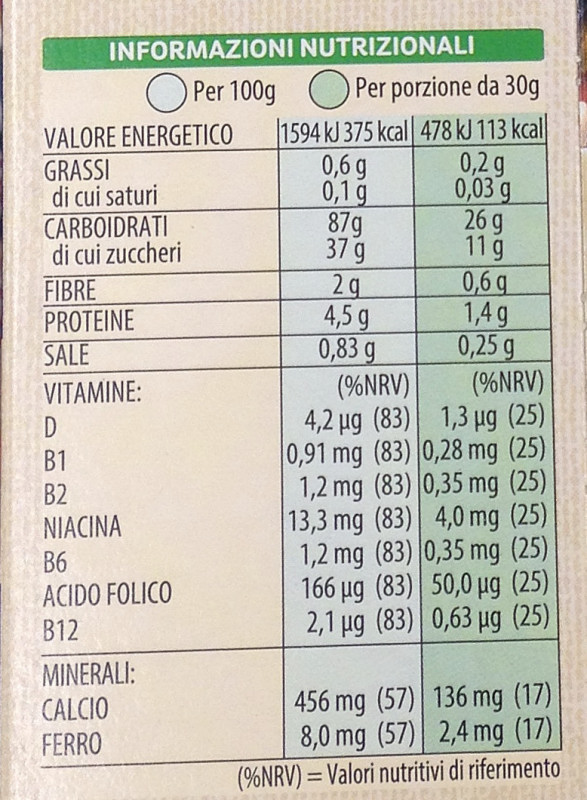 Barcode EAN:   8010265643104 Energy kcal/100g:   375 Satured Fat (per 100g)g:   0.1 Sugar into Carbohydrates (per 100g)g:   37 Proteines (per 100g)g:   4.5 Calcium CA/ mg (per 100g)g:   Gluten:   Production type:   Made in:   Price €:   Bought here:   Last update:   2016-10-21 16:08:35 | Brand:   Fat (per 100g)g:   0.6 Carbohydrates (per 100g)g:   87 Fiber (per 100g)g:   2 Salt - Sodium (per 100g)g:   0.83 Ingredients (Indicative):   |