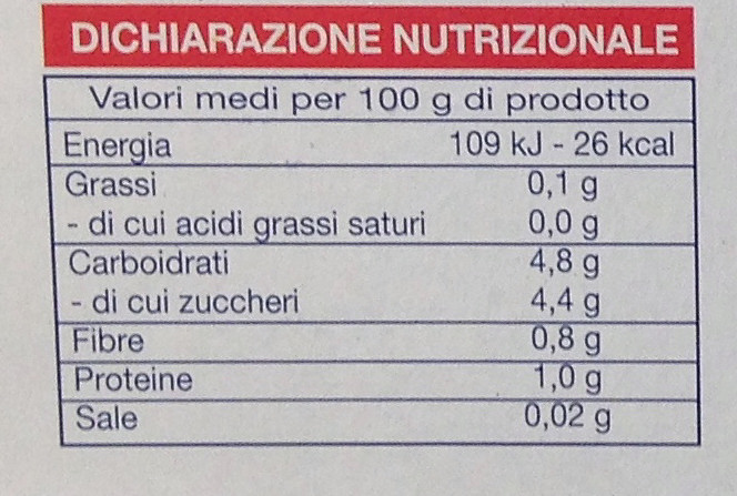 Barcode EAN:   Energy kcal/100g:   26 Satured Fat (per 100g)g:   Sugar into Carbohydrates (per 100g)g:   4.4 Proteines (per 100g)g:   1 Calcium CA/ mg (per 100g)g:   Gluten:   Production type:   Made in:   Italy Price €:   Last update:   2016-10-22 19:52:20 | Brand:   Fat (per 100g)g:   0.1 Carbohydrates (per 100g)g:   4.8 Fiber (per 100g)g:   0.8 Salt - Sodium (per 100g)g:   0.02 Ingredients (Indicative):   Bought here:   |