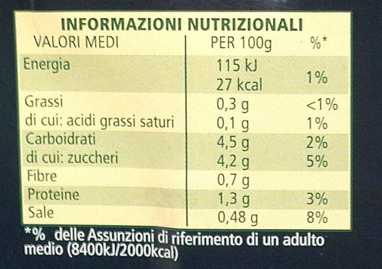 Barcode EAN:   8000050015100 Energy kcal/100g:   27 Satured Fat (per 100g)g:   0.1 Sugar into Carbohydrates (per 100g)g:   4.2 Proteines (per 100g)g:   1.3 Calcium CA/ mg (per 100g)g:   Gluten:   Production type:   Made in:   Italy Price €:   Last update:   2016-10-22 21:14:53 | Brand:   Fat (per 100g)g:   0.3 Carbohydrates (per 100g)g:   4.5 Fiber (per 100g)g:   0.7 Salt - Sodium (per 100g)g:   0.48 Ingredients (Indicative):   Bought here:   |