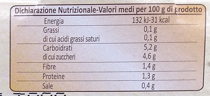 Barcode EAN:   8003294350020 Energy kcal/100g:   31 Satured Fat (per 100g)g:   0.1 Sugar into Carbohydrates (per 100g)g:   4.6 Proteines (per 100g)g:   1.3 Calcium CA/ mg (per 100g)g:   Gluten:   Production type:   Made in:   Italy Price €:   Bought here:   Last update:   2016-10-23 09:52:41 | Brand:   Fat (per 100g)g:   0.1 Carbohydrates (per 100g)g:   5.2 Fiber (per 100g)g:   1.4 Salt - Sodium (per 100g)g:   0.4 Ingredients (Indicative):   |
