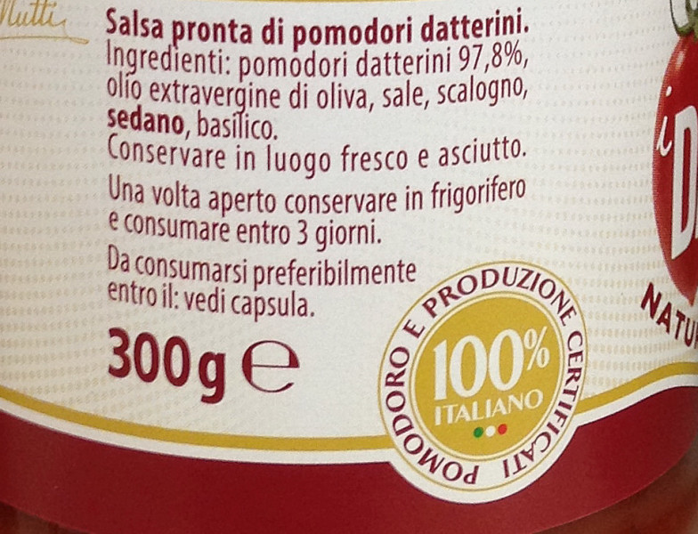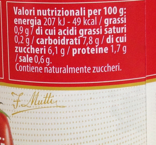 Barcode EAN:   8005110172052 Energy kcal/100g:   49 Satured Fat (per 100g)g:   0.2 Sugar into Carbohydrates (per 100g)g:   6.1 Proteines (per 100g)g:   1.7 Calcium CA/ mg (per 100g)g:   Gluten:   Production type:   Made in:   Italy Price €:   Bought here:   Last update:   2016-10-23 19:27:53 | Brand:   Fat (per 100g)g:   0.9 Carbohydrates (per 100g)g:   7.8 Fiber (per 100g)g:   Salt - Sodium (per 100g)g:   0.6 Ingredients (Indicative):   |