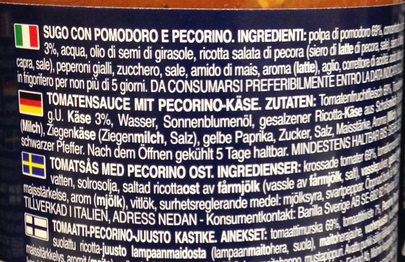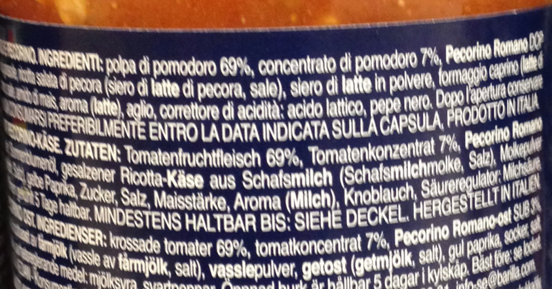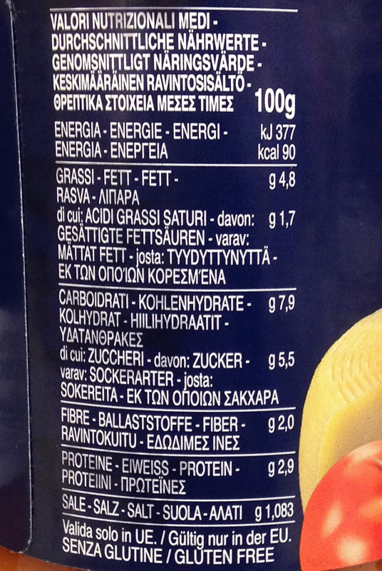 Barcode EAN:   8076809527378 Energy kcal/100g:   90 Satured Fat (per 100g)g:   1.7 Sugar into Carbohydrates (per 100g)g:   5.5 Proteines (per 100g)g:   2.9 Calcium CA/ mg (per 100g)g:   Gluten:   Production type:   Made in:   Italy Price €:   Bought here:   Last update:   2016-10-23 19:57:23 | Brand:   Fat (per 100g)g:   4.8 Carbohydrates (per 100g)g:   7.9 Fiber (per 100g)g:   2 Salt - Sodium (per 100g)g:   1.083 Ingredients (Indicative):   |